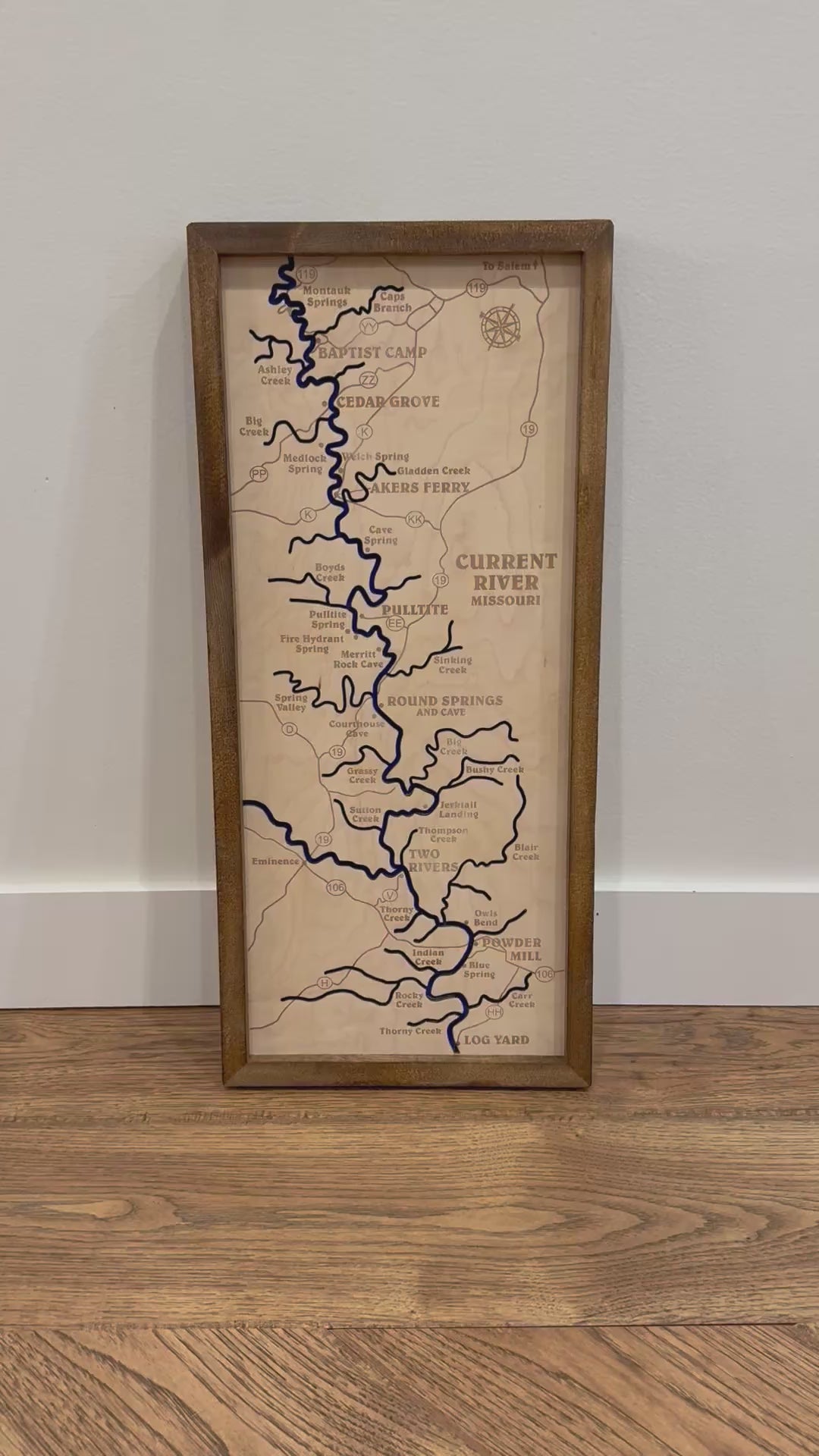 Show your love for the river with this etched Current River Sign. It shows all the popular destinations along the Current River from Montauk Springs to Log Yard. The main path of the river is cut out to show the blue of the river through the depth of the sign.